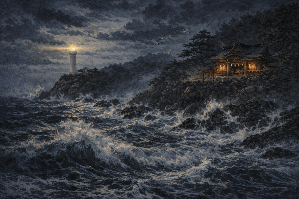 神社が心を静め、不安に打ち勝つ力を与えてきた場所だとすれば、灯台は暗闇の中で確かな目印となる存在です。方法は違っても、自然の前に立つ人間の切実な願いは同じです。